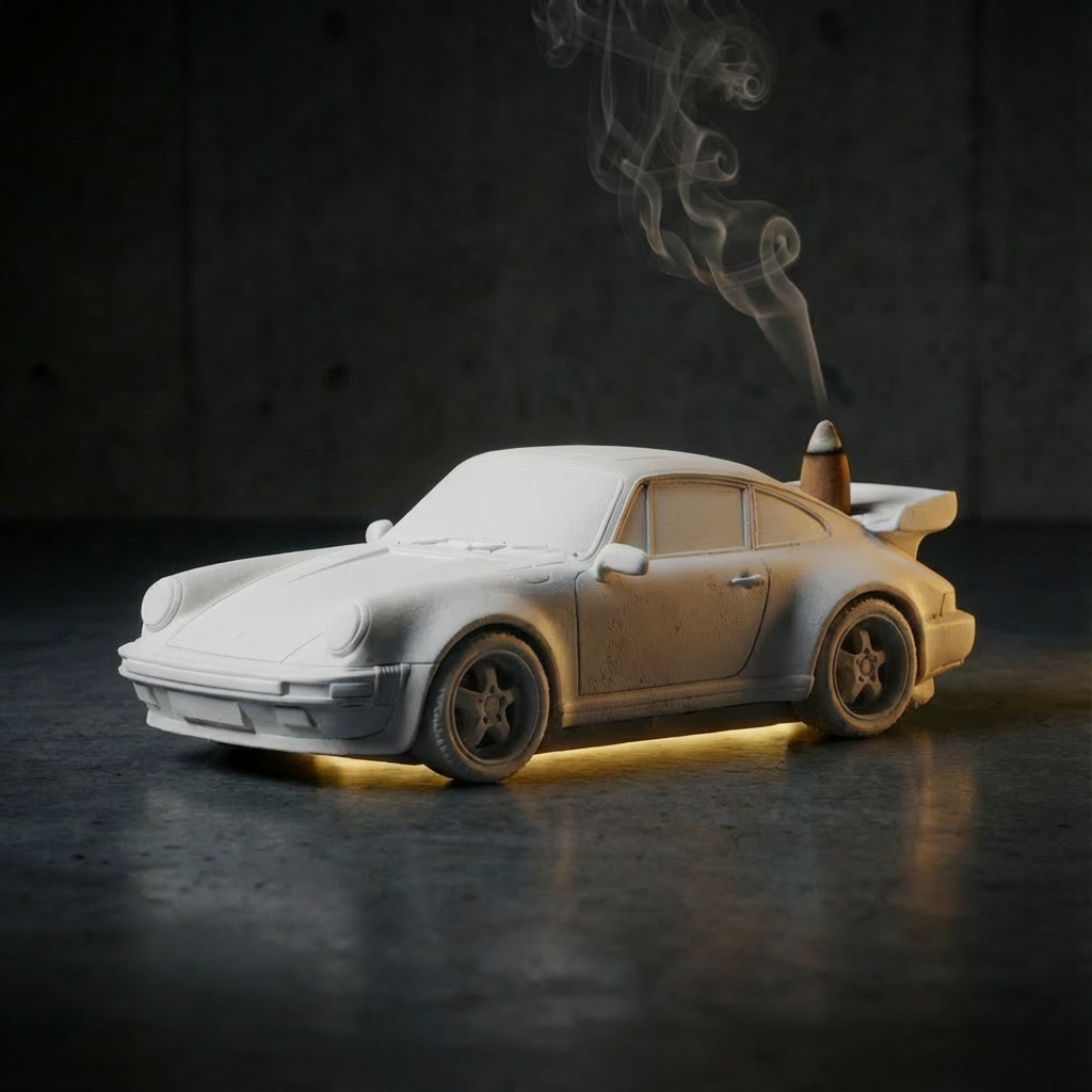 A hand-cast, minimalist car figurine with a space for a fragrance cone in the rear wing. A small detail that creates a unique atmosphere in your home or office. Each piece is unique.